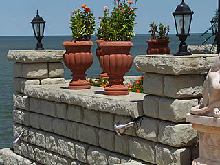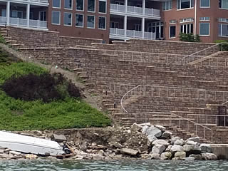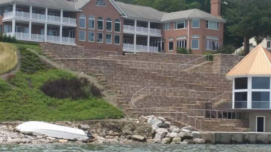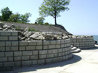 No-Geogrid-North-Coast-Redi-RockLakefront clients want a secure and natural looking stone block face. North Coast Redi-Rock offers great solutions for these walls.